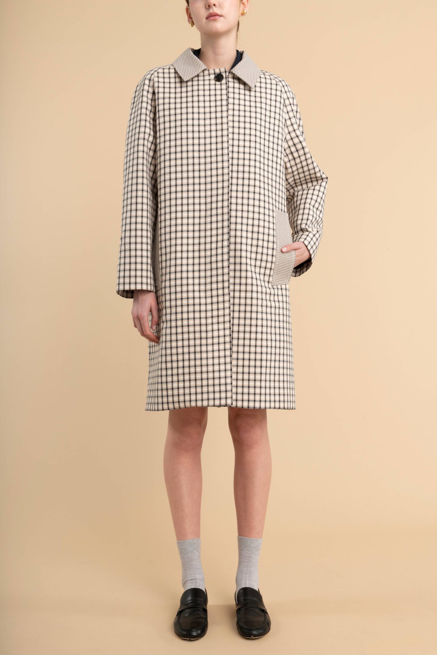 This coat begins in Prato at a mill that has been weaving coating fabrics since 1916, and whose double-cloth cotton is among the few that carry genuine weight without stiffness. At 520 g/m², the fabric has the density of a considered choice: it moves with authority, holds its line at the hem, and improves with every wearing. The double cloth is kept whole rather than split, then lined — a decision that preserves the full weight and gives the coat the quiet heft you notice the moment you lift it from the hanger. The silhouette is a raglan car coat in its purest form: no epaulettes, no storm hardware, no ornamentation that wasn't there at the beginning. Four fitting sessions reduced it to this — the sleeve fall, the hem length, the pocket placement — until nothing remained that didn't need to be there. Finished with horn buttons engraved with the Tess Lorenz mark.